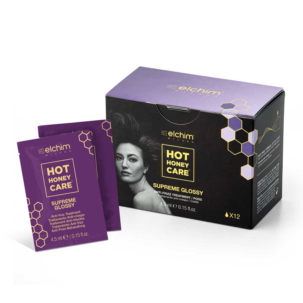 Hot Honey Care Supreme Glossy est né des laboratoires Elchim, le seul traitement 3 en 1 pour sécher, coiffer et traiter en un seul passage. Le traitement, associé à l'utilisation des sèche-cheveux Elchim, transforme les cheveux en séchant et en coiffant avec un effet immédiat. . La chaleur et le flux d'air du sèche-cheveux activent les principes contenus dans les dosettes tout en séchant, coiffant et traitant les cheveux en un seul geste rapide, avec une parfaite uniformité. En insérant le dosette Supreme Glossy dans le concentrateur cosmétique spécial pour votre sèche-cheveux Elchim, vous obtiendrez immédiatement un effet anti-frisottis visible avec des cheveux plus doux et plus brillants.