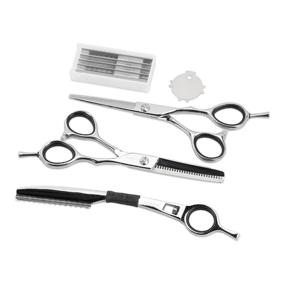 1 kappersschaar, 1 effileerschaar met 28 tanden, 1 haar scheermes + 5 reserve mesjes, 1 spanningsschroef